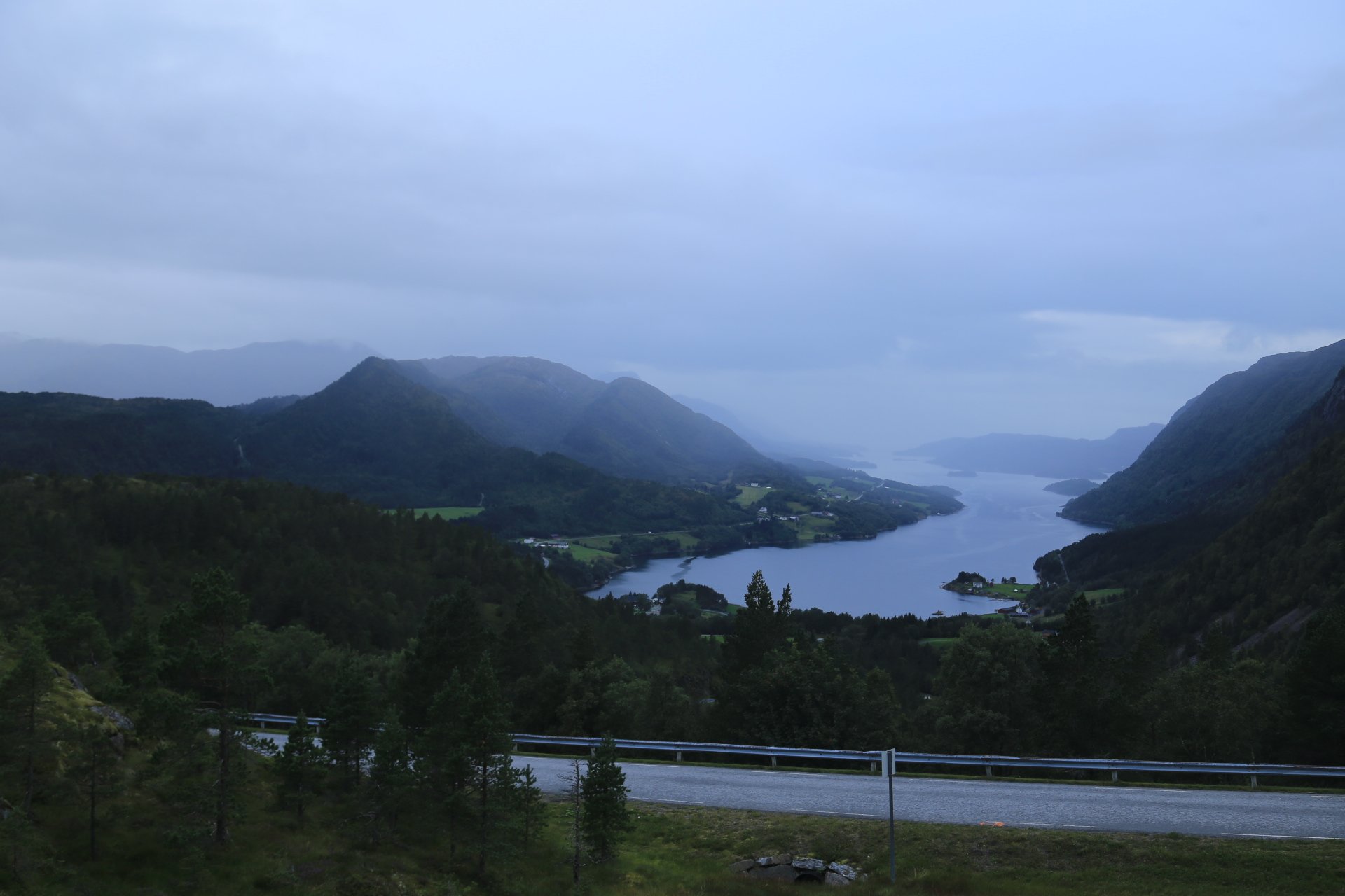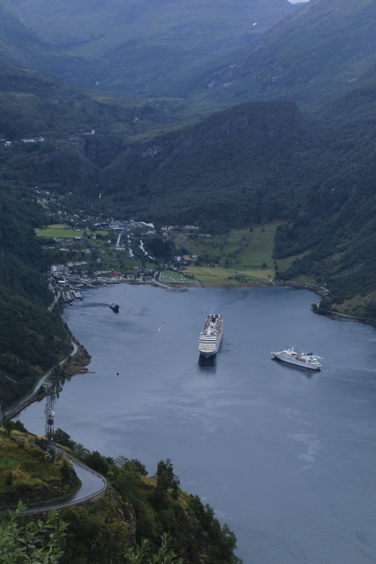 Dennoch machen wir uns auf den Weg, schrauben uns über die nächsten Serpentinen aus dem Fjord, finden ein nettes Plätzchen zum Frühstück mit Blick auf Geiranger, beobachten zum Kaffee wie zwei Kreuzfahrtschiffe mühsam im Fjord einparken.