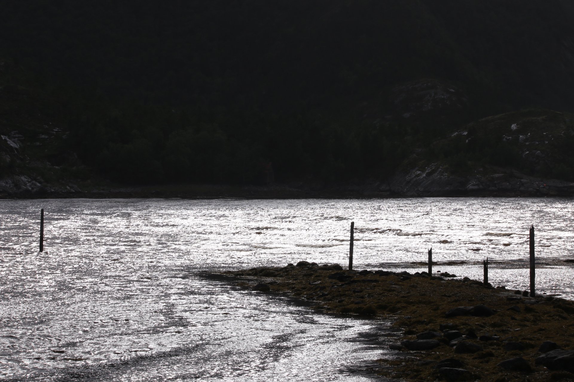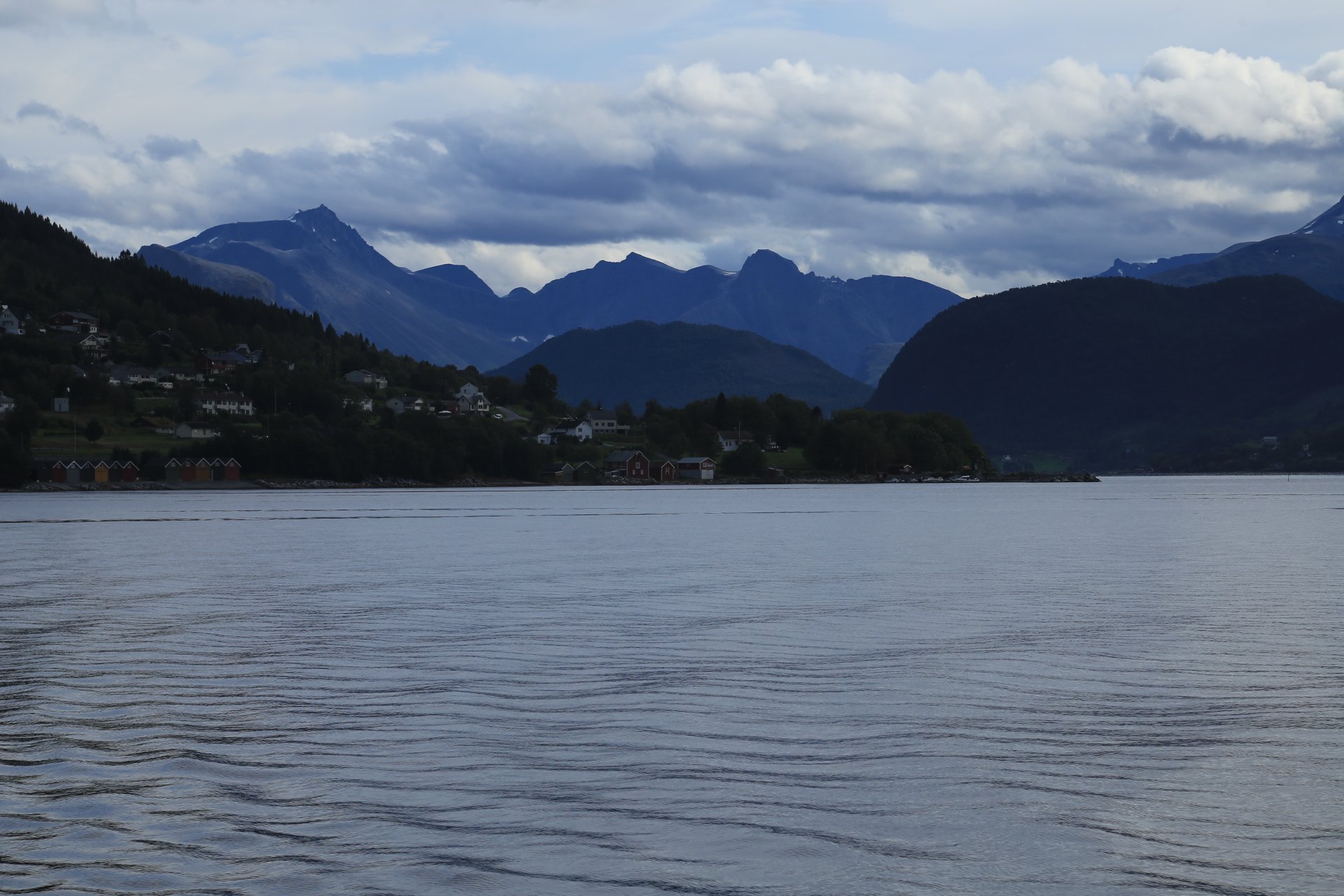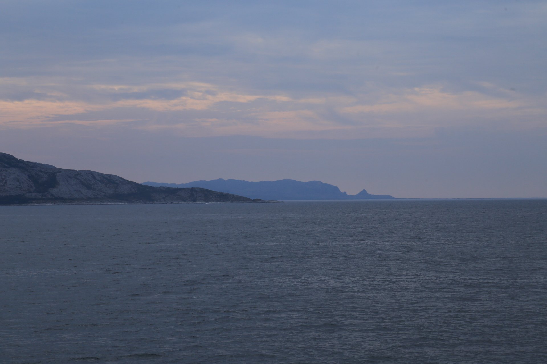 Ein Sonnenstrahl, der an einer leicht verrutschten Ecke der Verdunkelung vorbei kommt, weckt mich. Unwillig schaute ich auf die Uhr, 6:10. Eindeutig zu früh! Aber wenn schon einmal wach, dann will die Biologie befriedigt werden, und ich mache mich auf den Weg zur Toilette… wie ist das schön! Die Sonne schiebt sich auf der anderen Seite des Fjords an den Himmel.