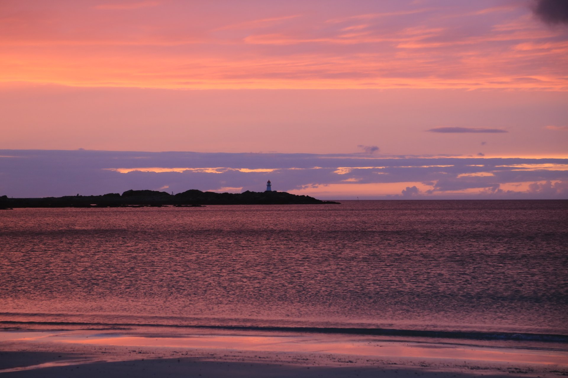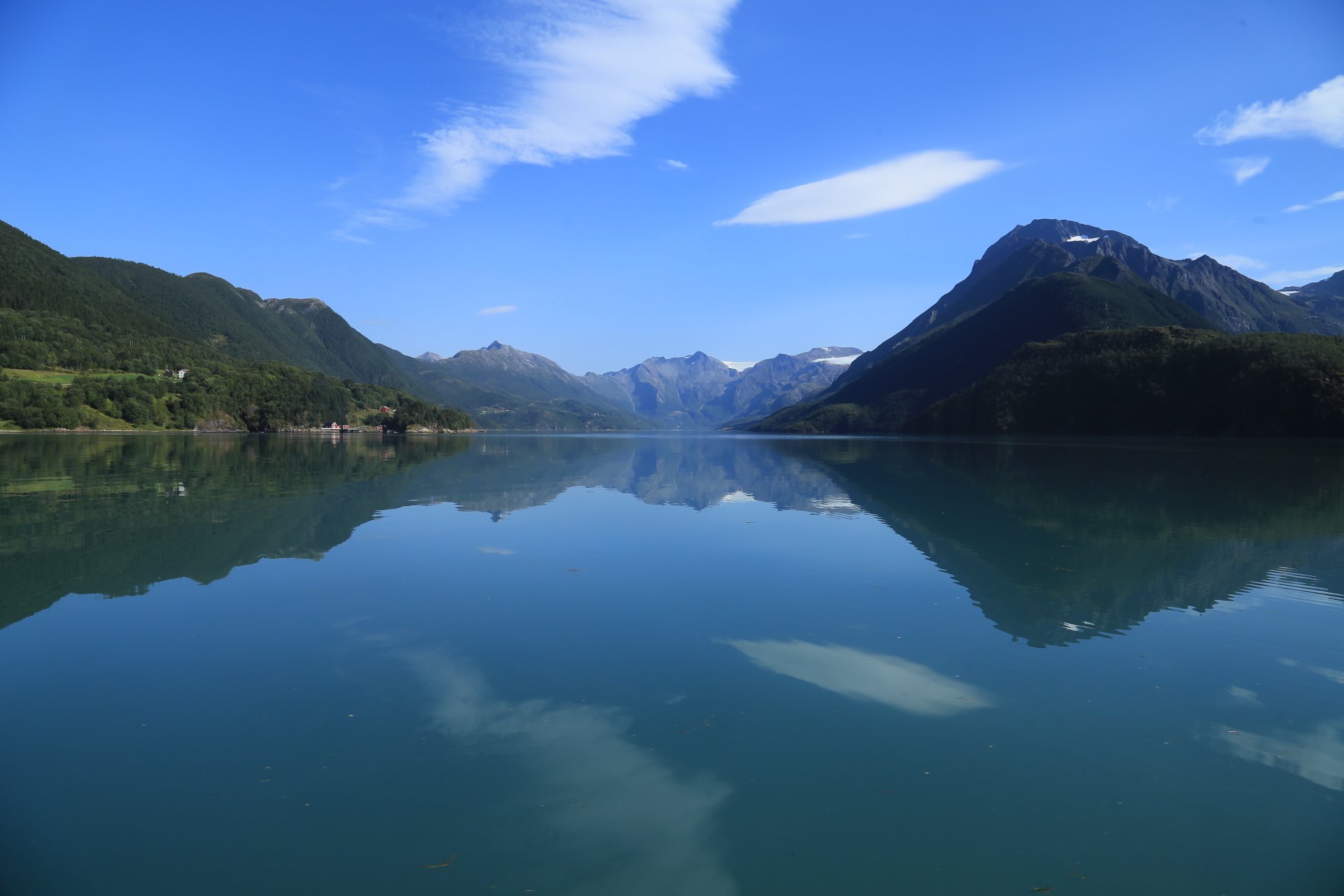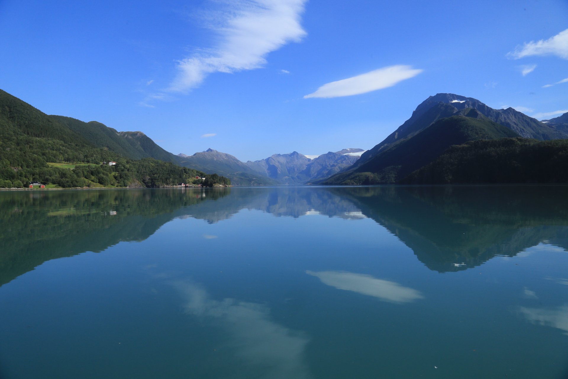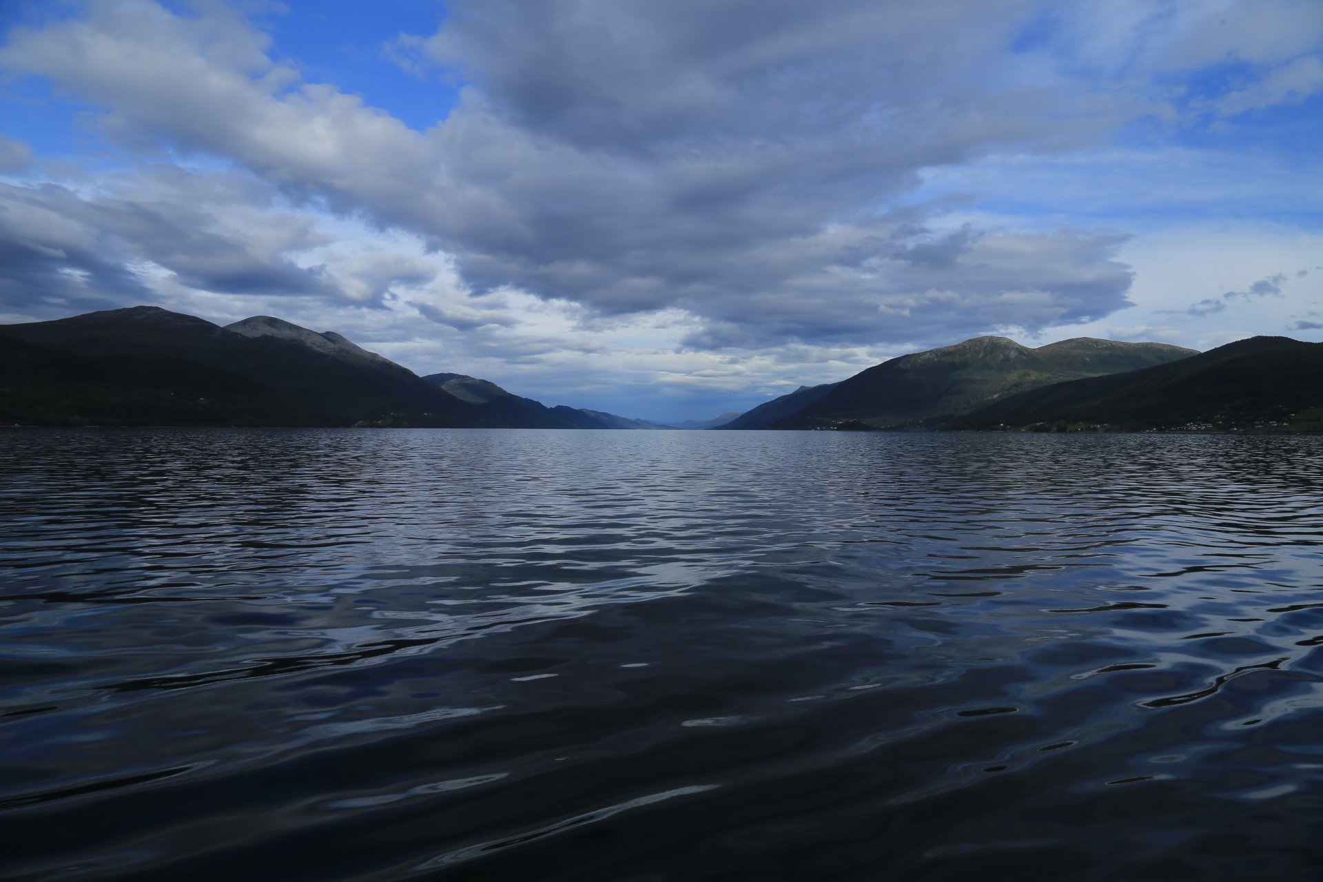 Ein Sonnenstrahl, der an einer leicht verrutschten Ecke der Verdunkelung vorbei kommt, weckt mich. Unwillig schaute ich auf die Uhr, 6:10. Eindeutig zu früh! Aber wenn schon einmal wach, dann will die Biologie befriedigt werden, und ich mache mich auf den Weg zur Toilette… wie ist das schön! Die Sonne schiebt sich auf der anderen Seite des Fjords an den Himmel.