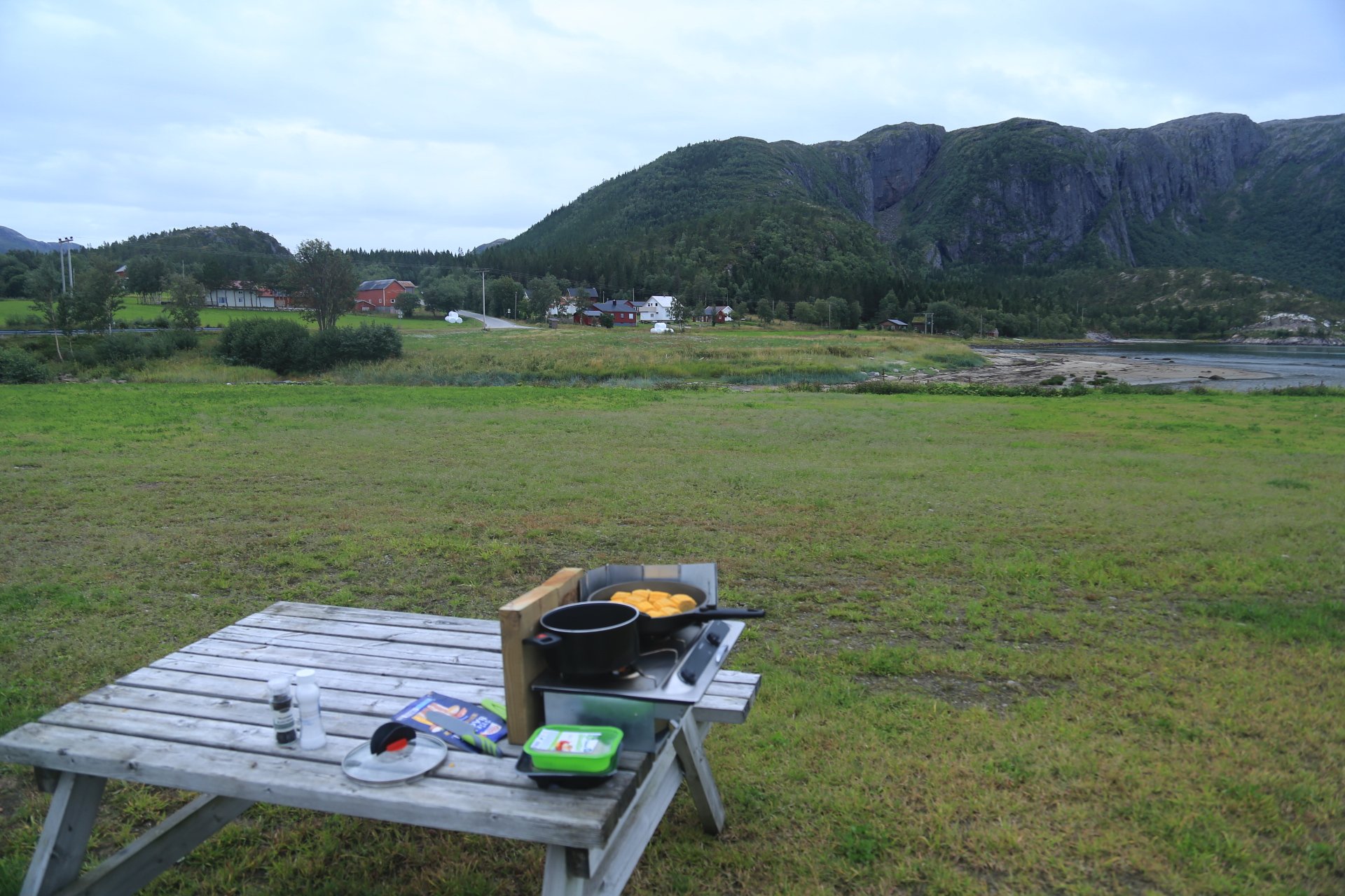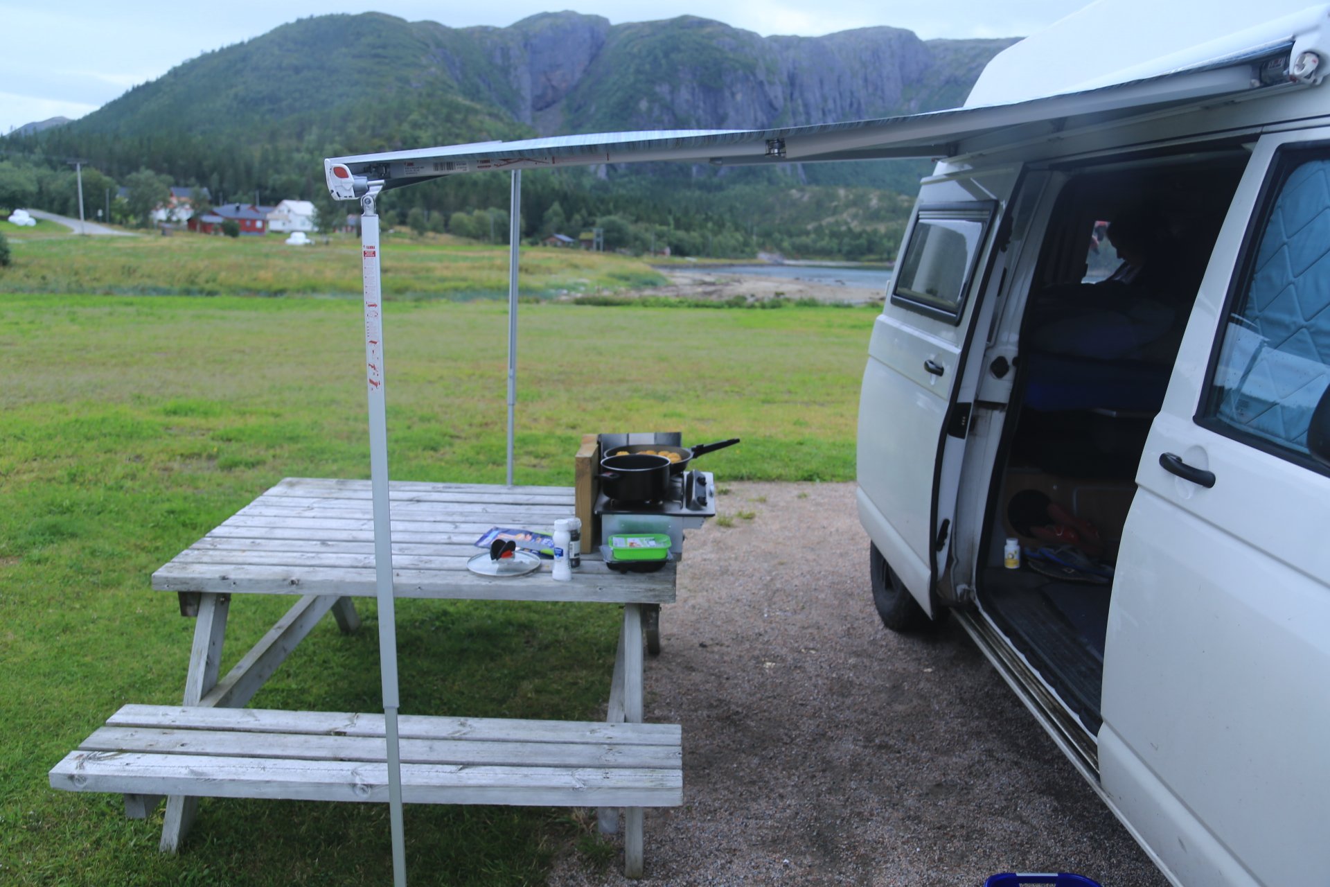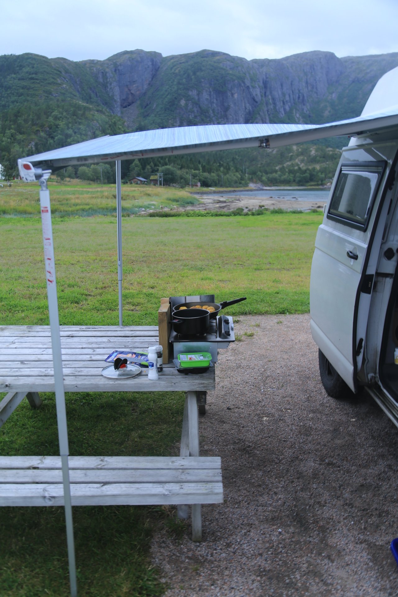 Zwar keine Sonne aber windstill verleitet uns wieder unsere Outdoor Küche anzuschmeisen, Burger und gebratener Fisch sind im Bus auch nicht erste Wahl.