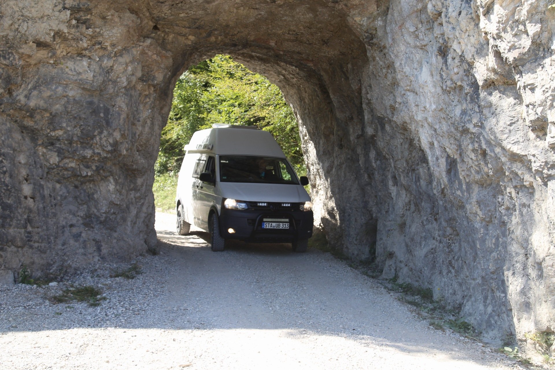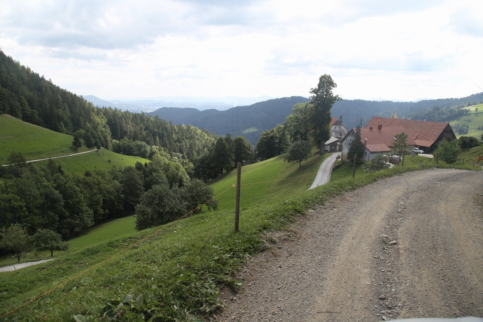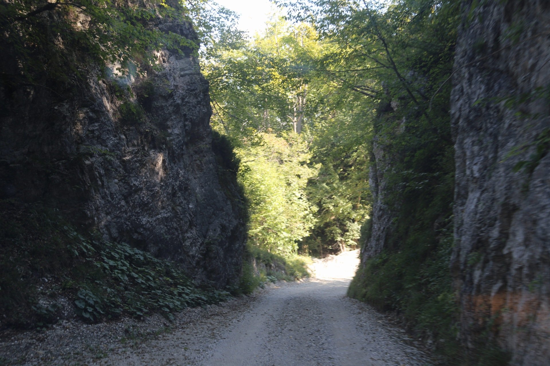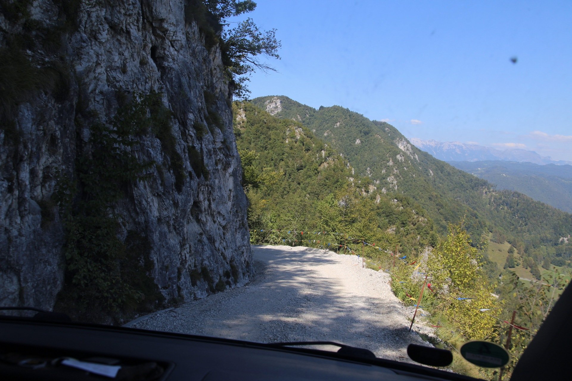 Sind wir bei der Anreise am Montagabend so ziemlich alleine auf dem Pass unterwegs gewesen, so ist heute am Samstagvormittag die Hölle los. Oben auf dem Pass ist alles zugeparkt, inklusive einer Fahrspur der schmalen Straße. Zu allem Überfluss kommt uns hier auch noch ein Reisebus entgegen. Jeder fährt erstmal in die Engstellen rein, bis nichts mehr geht und wartet darauf das der andere sich in Luft auflöst. Nachdem wir uns einfach nicht in Luft auflösen wollen und wir lang genug gestikulieren, fängt man halt doch an ein wenig rückwärts zu rangieren, bis ich mich Zentimeterweise vorbeischieben kann um Luft zu schaffen damit sich der Knoten aus Blech lösen kann. Ein ruhiges Frühstücksplätzchen werden wir hier nicht finden, so fahren wir langsam weiter. Das Caos begleitet uns noch eine ganze Weile. Halb Slowenien scheint sich hier auf dem Pass zu versammeln und es kommen uns beim Runterfahren immer mehr Autos entgegen, die auf den Pass wollen. So gleicht unsere Abreise ehr einer Flucht. In 30 Jahren Alpenfahren habe ich bisher nicht ansatzweise ein vergleichbares Caos gesehen.
