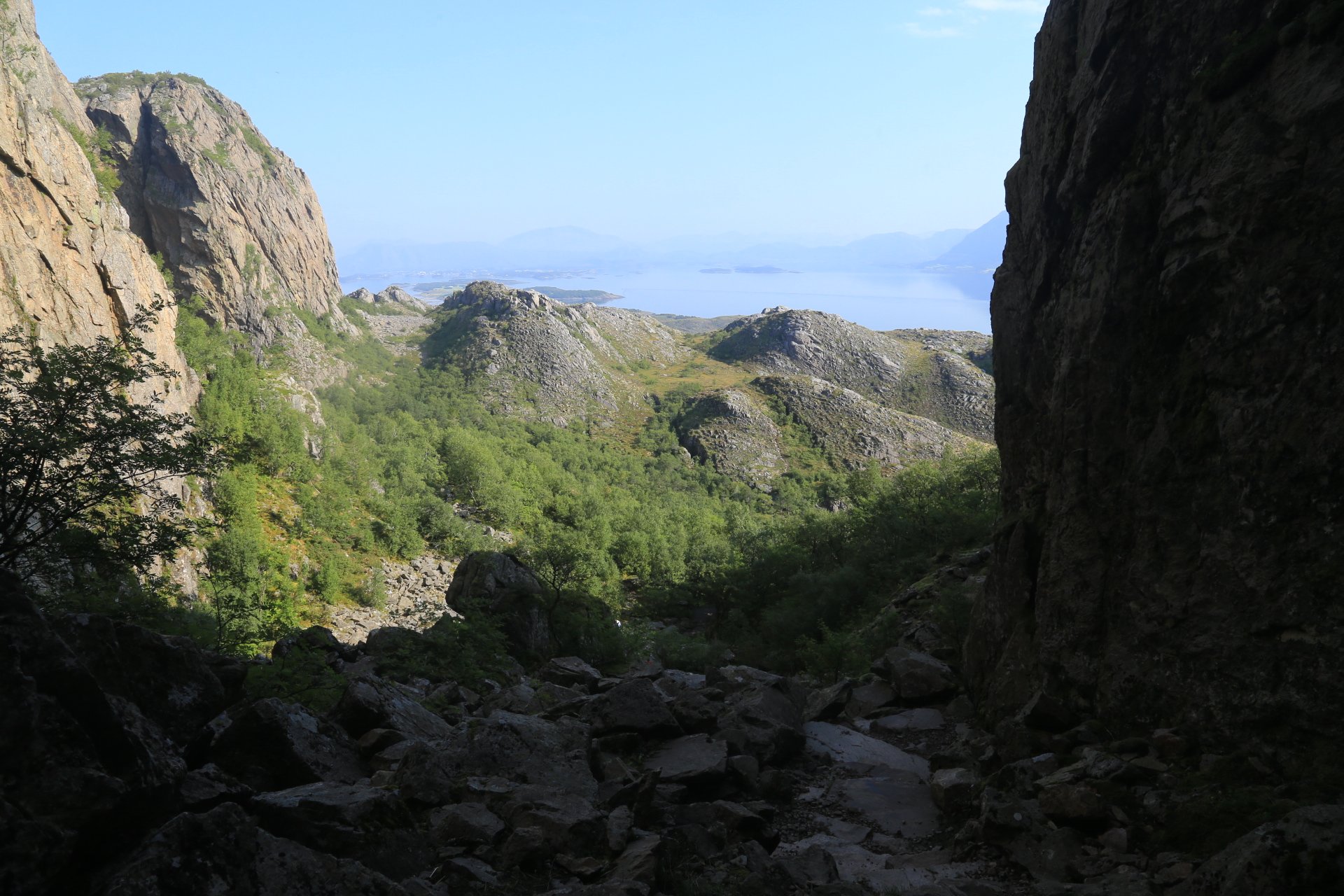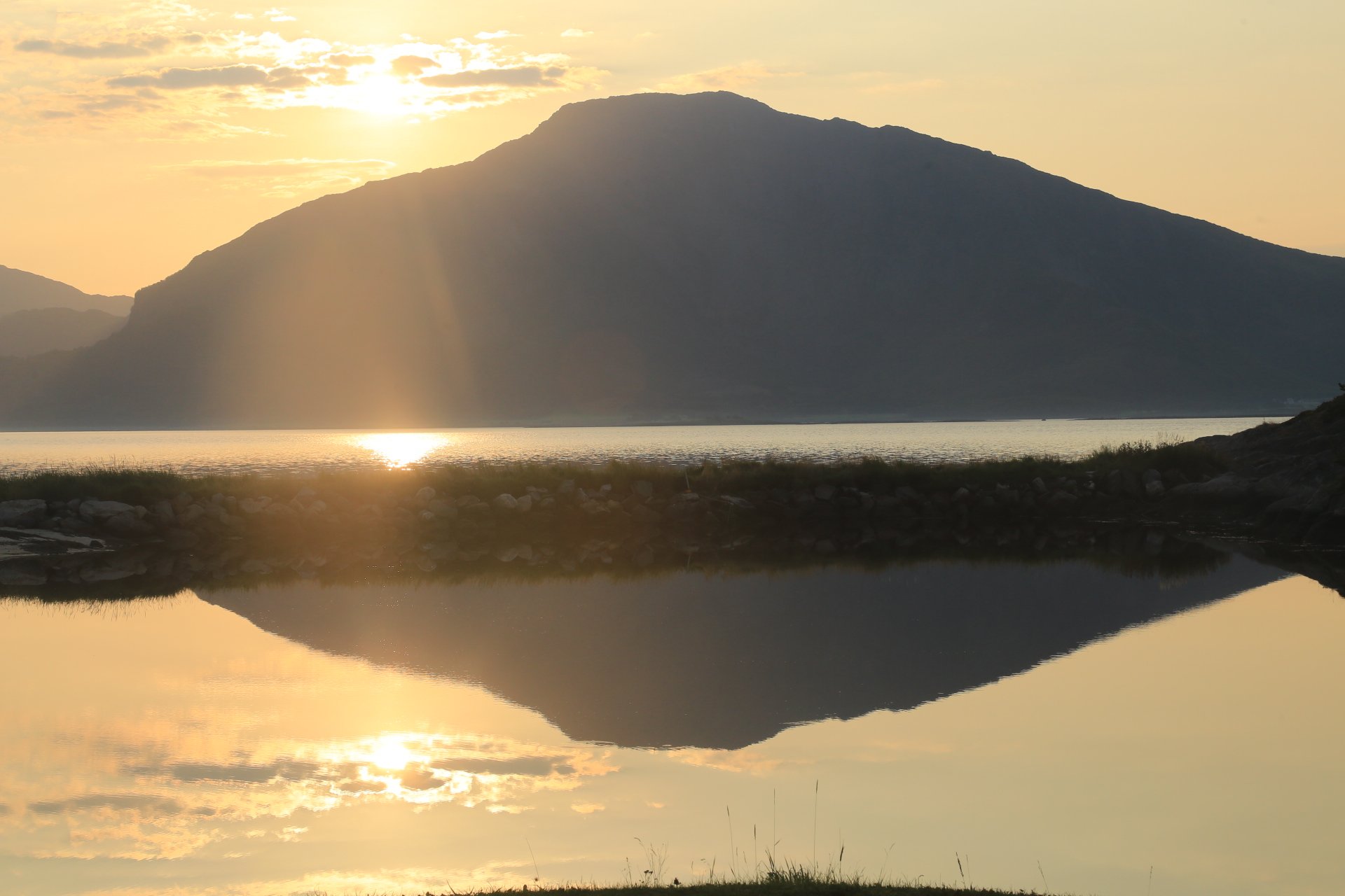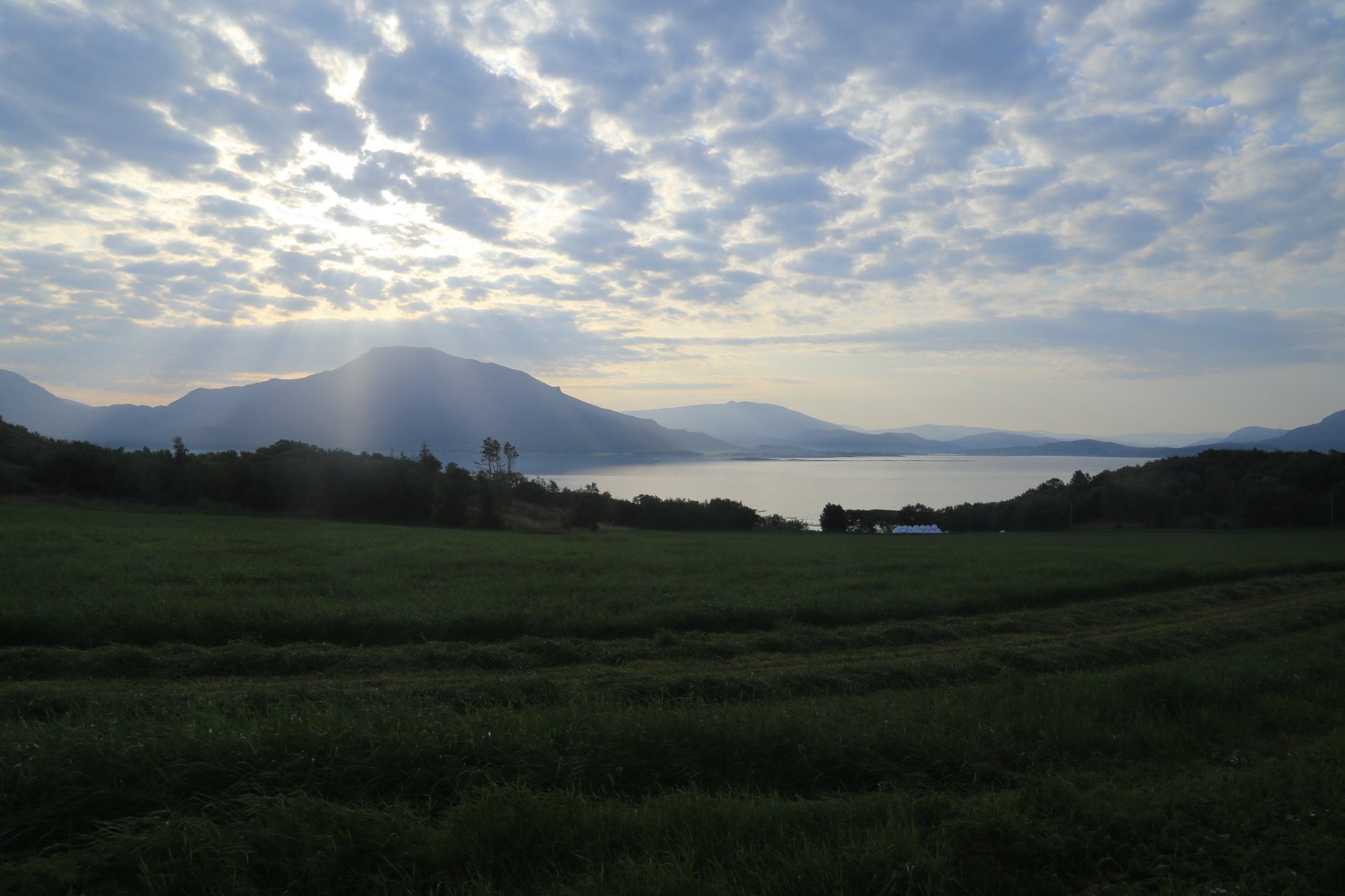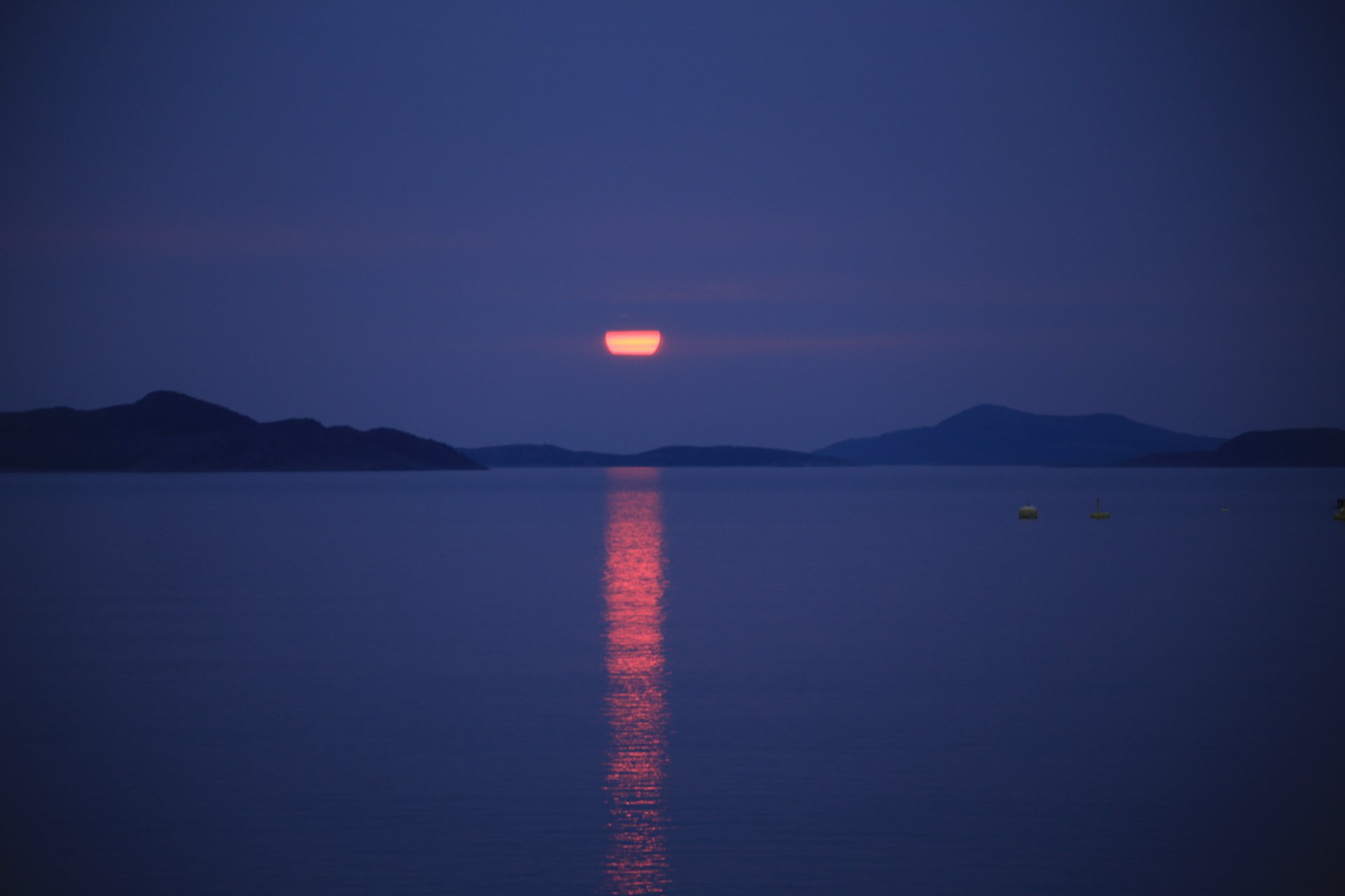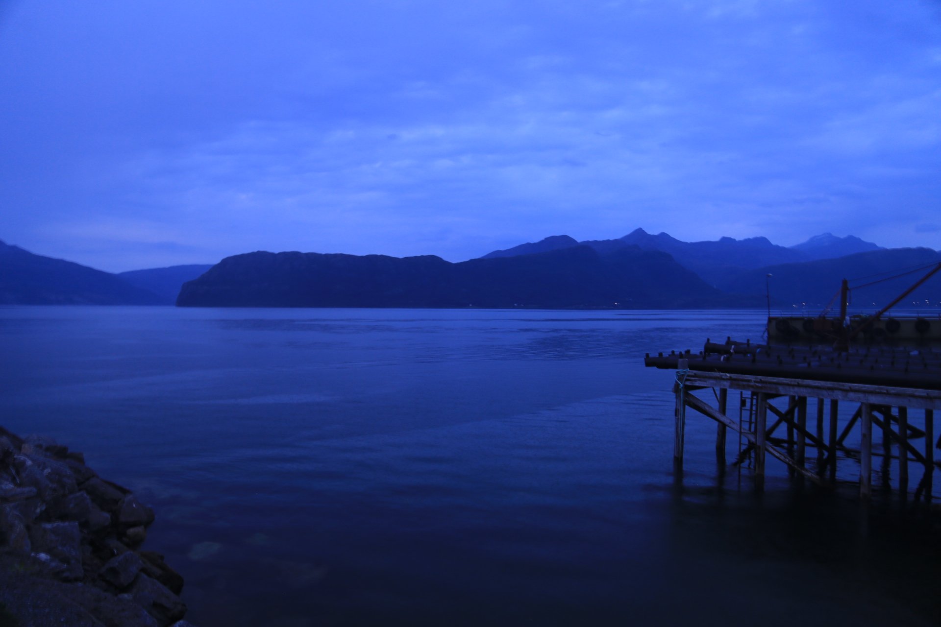 Ein Sonnenstrahl, der an einer leicht verrutschten Ecke der Verdunkelung vorbei kommt, weckt mich. Unwillig schaute ich auf die Uhr, 6:10. Eindeutig zu früh! Aber wenn schon einmal wach, dann will die Biologie befriedigt werden, und ich mache mich auf den Weg zur Toilette… wie ist das schön! Die Sonne schiebt sich auf der anderen Seite des Fjords an den Himmel.